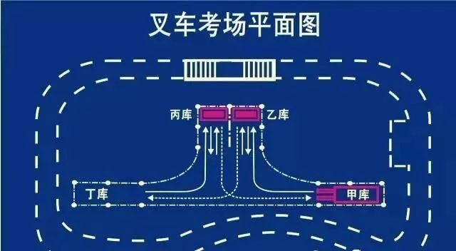 作業(yè):乙?guī)斓呢浖埽ǜ叩哪莻€)入叉叉貨以后倒車直接升到頂(油缸提升的時候要加油提速,不要怠速提升),放下后稍微停一下,馬上又提升放回下層,然后倒車入丁庫,入庫時只要求整車身入庫,入庫后,貨叉要放到地,不然要扣分。丙庫的貨架一樣的操作,貨架放地上以后,倒車回甲庫起點,貨叉也要入庫,謹記貨叉要后傾并提升至離地20-40cm。