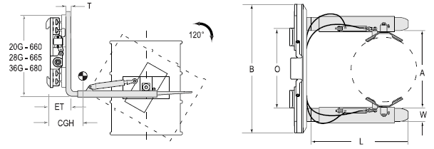 | Capacity 承載能力(kg) | Catalog Order NO 型號 | Mounting Class 安裝等級 | Capacity Load Center on forks承載能力@貨叉載荷中心(kg@mm) | Frame Width 框架寬度B(mm) | Opening Range張臂范圍A(mm) | Fork Size貨叉尺寸LxWxT(mm) | Minimum Truck Carriage Width叉車貨叉架寬度最小值O(mm) | Weight 自重(kg) | Effective 失載距ET(mm) | Horizontal Center of Gravity 水平重心CGH(mm) |